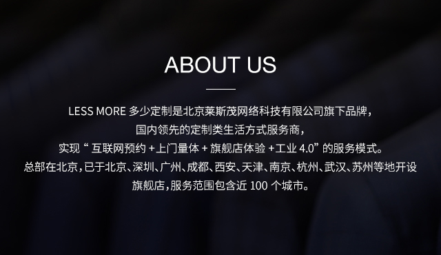 LESS MORE 多少定制是能夠提供男士全品類定制產(chǎn)品的生活方式品牌,對(duì)于中國(guó)商務(wù)男士來(lái)說(shuō),定制是對(duì)西裝最認(rèn)真的態(tài)度。